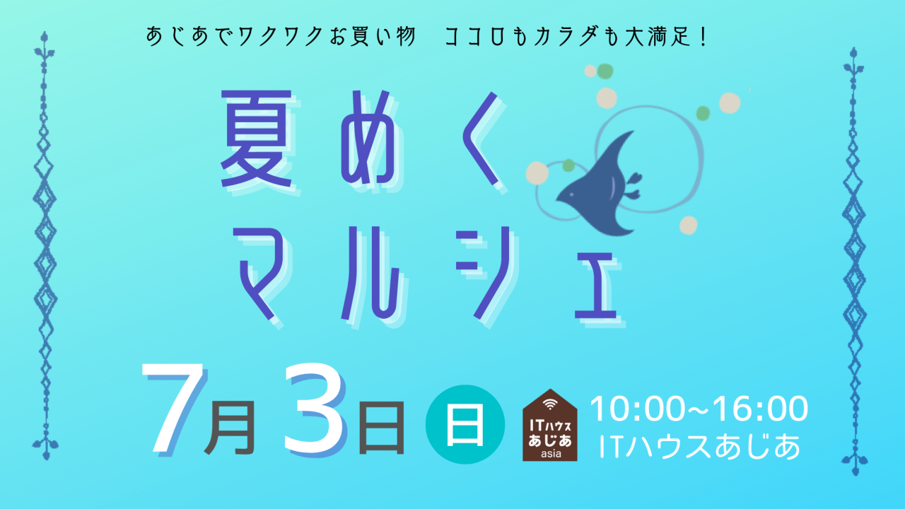 梅雨が明けました!夏めくじゃなくて、夏だよマルシェになっていますが(笑) 大人のおしゃれから、かわいい子供服までいろんなかわいいがそろいますよ!ぜひ 夏のおしゃれを探しに来てくださいね!