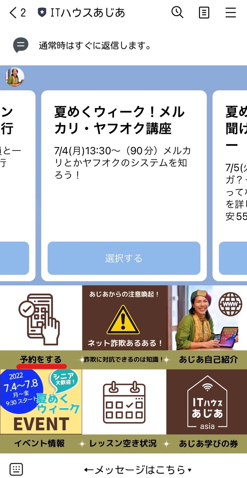LINEに表示されるメニューの「予約をする」を選んでください。